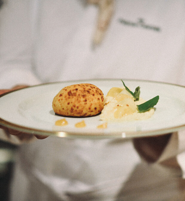masa de harina de maíz orgánica y quesos que envuelve un aromático relleno de carne vacuna. Las guarniciones propuestas por Courtois fueron picles de mamón verde silvestre, brotes de espinaca y arvejas.